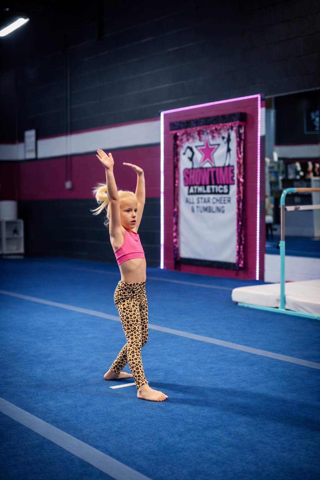 Our All-Star Cheerleading Program is designed for girls who want to join the gym’s competitive cheer team and train for national-level events. Athletes work on advanced stunts, tumbling, jumps, and routines with a strong focus on precision and teamwork. Meeting twice per week, this program helps committed athletes build the strength, discipline, and performance skills needed to compete at a high level.